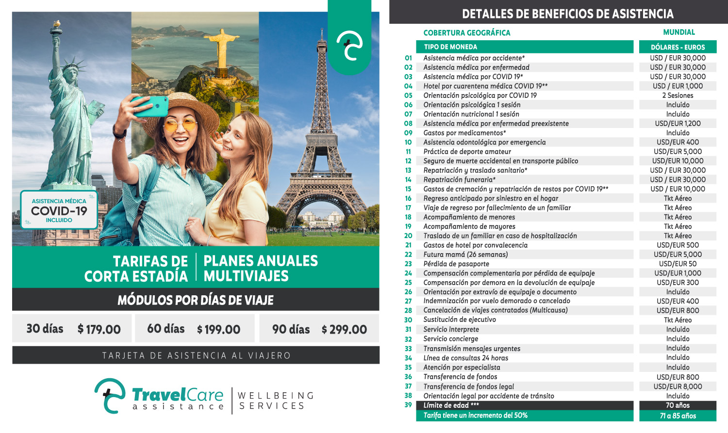 Aplica en todos nuestros planes de asistencia con destino mundial. Si desea conocer mayores detalles y especificaciones de los beneficios (Up grades) consulte y solicite a su asesor de asistencias y/o de viajes por nuestro condicionado general de los servicios de asistencia.